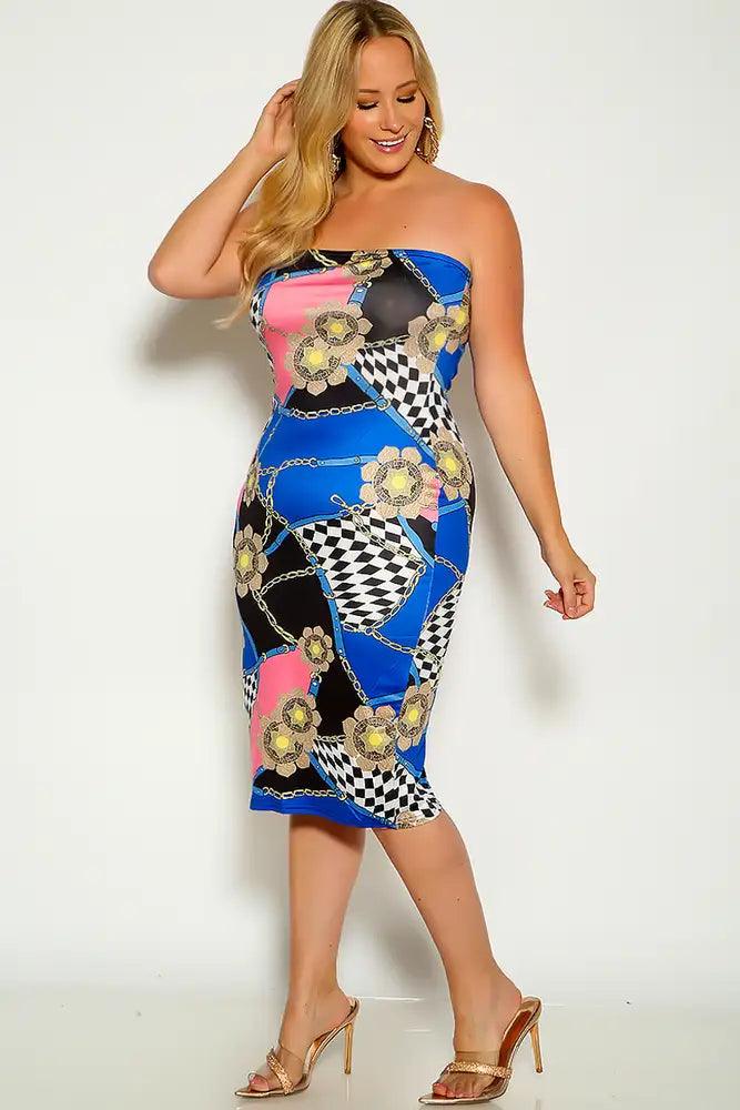 Blue Gold Strapless Graphic Print Fitted Plus Size Party Dress