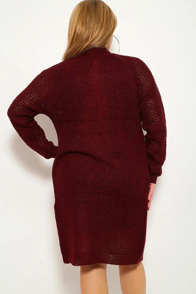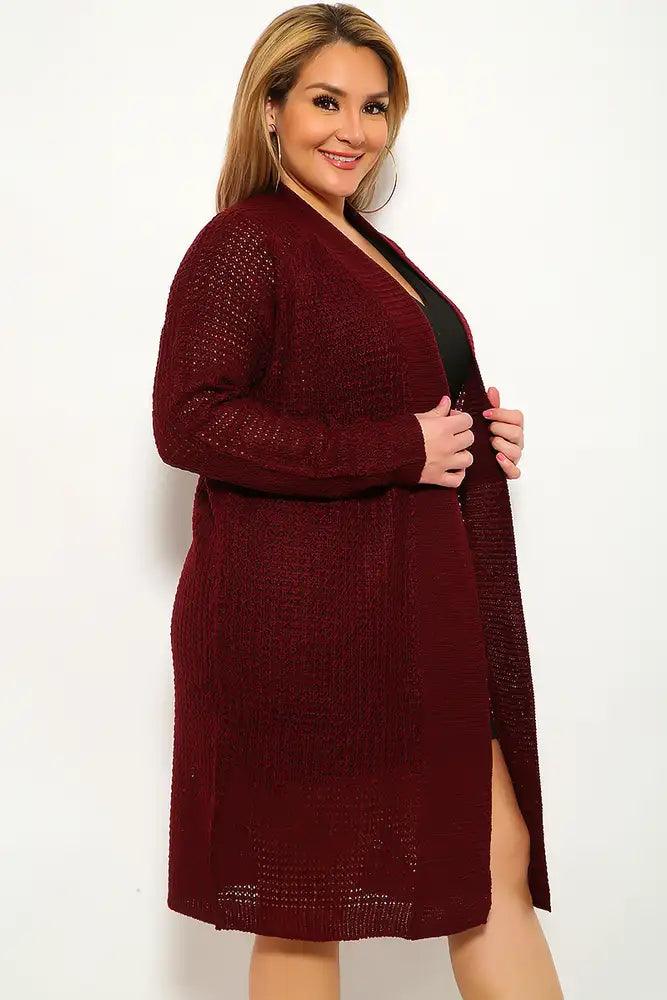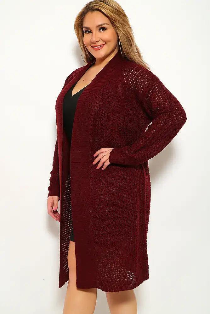 Wine Knitted Long Sleeve Plus Size Cardigan