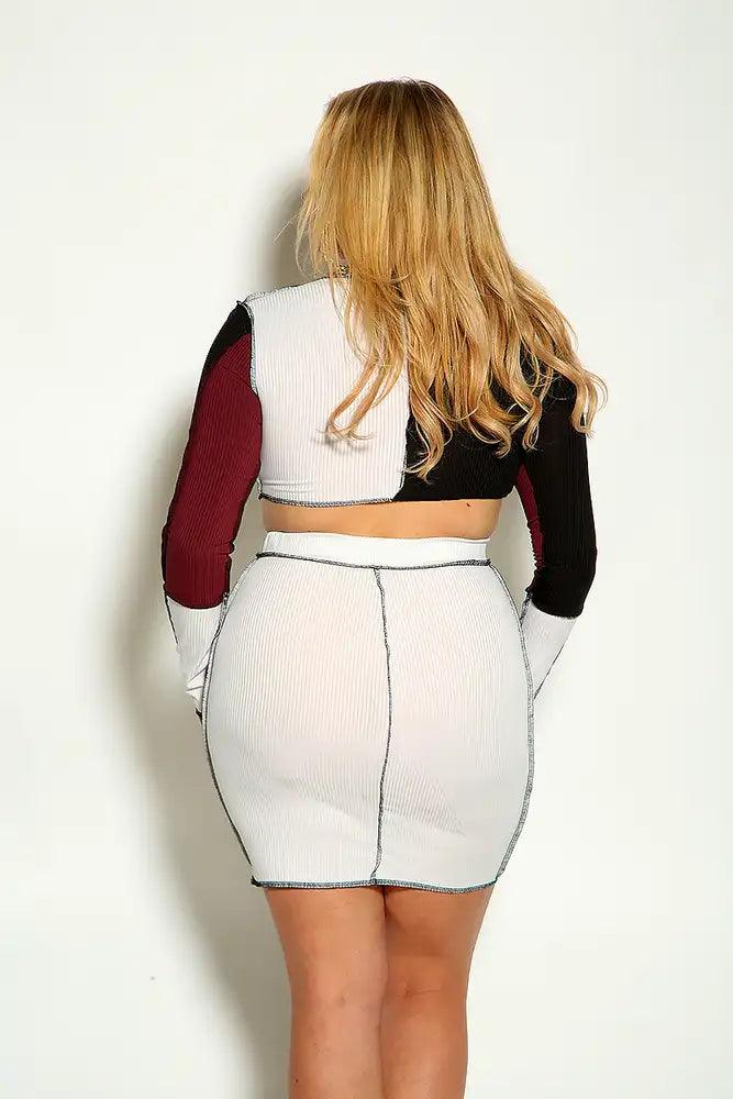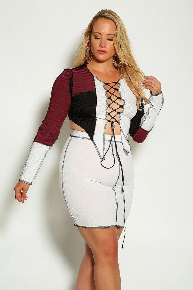 White Black Lace Up Stitched Detail Plus Size Two Piece Dress