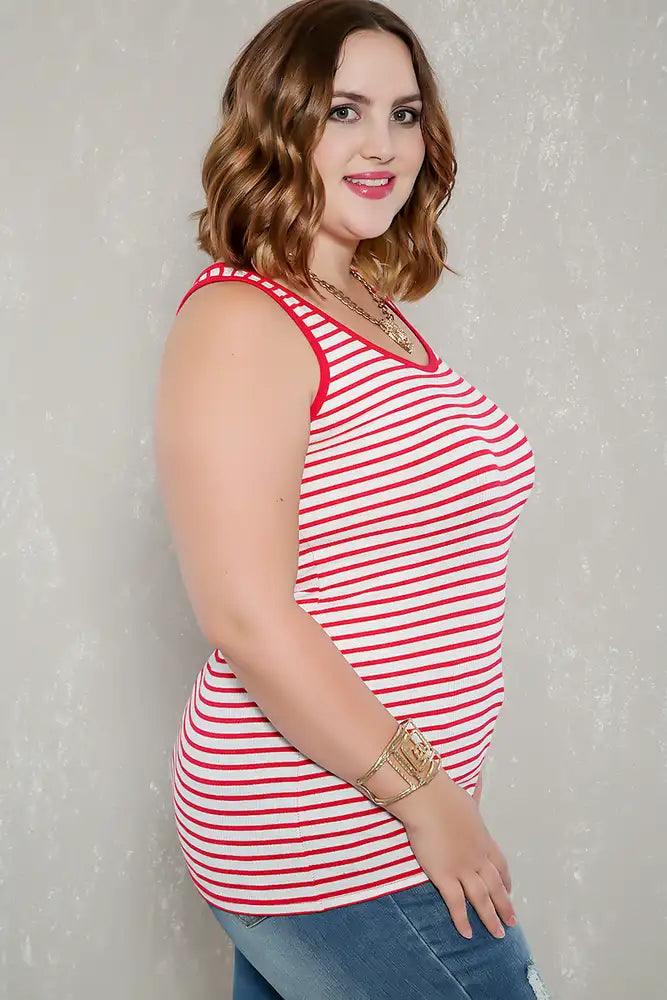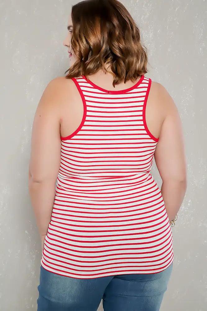 Sexy White Red Striped Ribbed Sleeveless Casual Plus Size Top