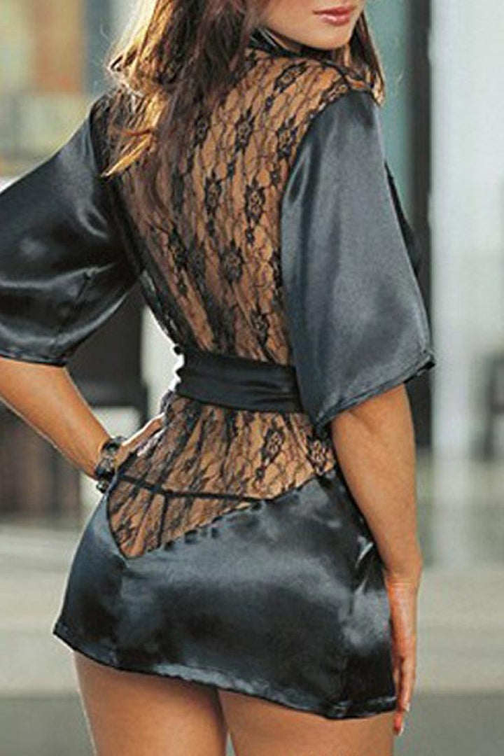 Black Satin Lace Belted Robe Kimono 2Pc Lingerie