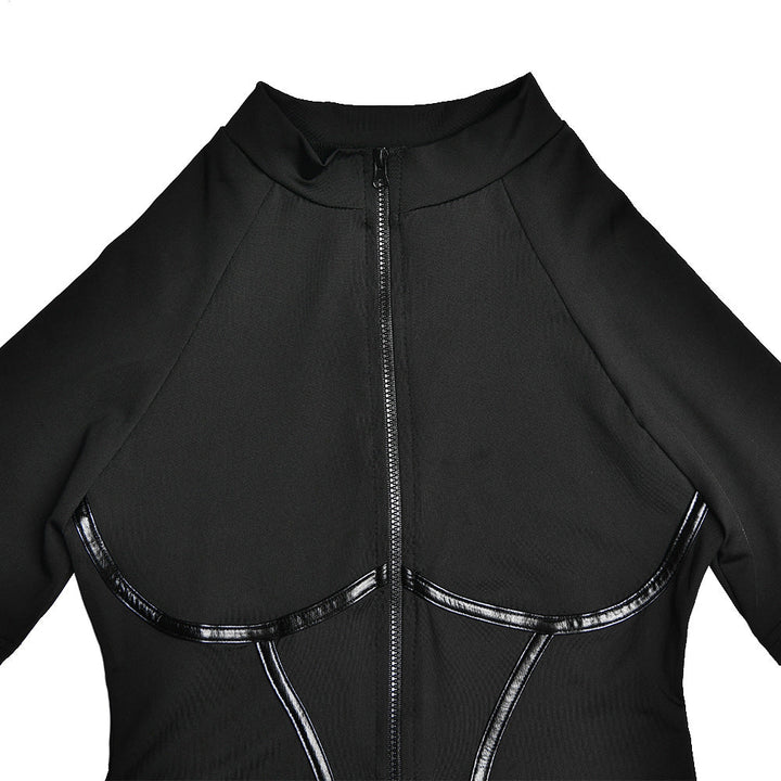 Black Zipper Faux Leather Body Contouring Piping Sexy Fitted Romper