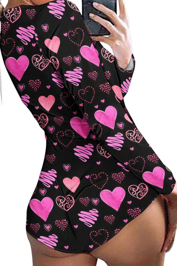 Black Pink Heart Printed Long Sleeve Sexy Fitted Casual Romper PJ