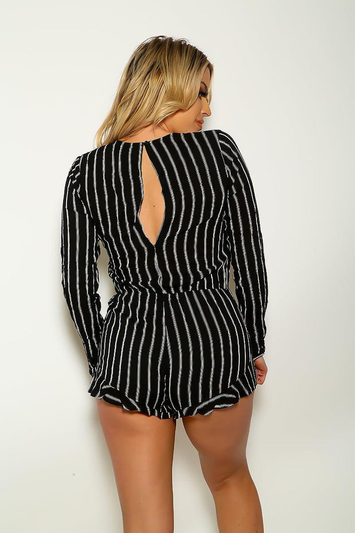 Show off your curves in this sexy romper! Featuring; long sleeves, black/ white striped, lace up front, cut open back, followed by a fitted wear. Non Stretch.