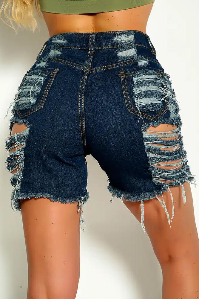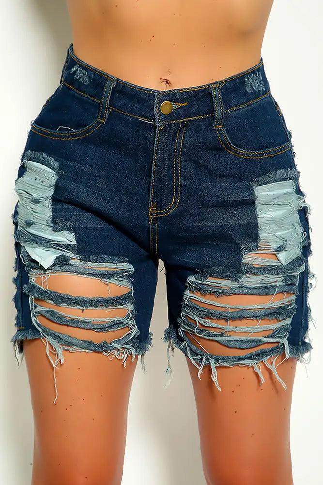 Dark Blue Denim Distressed Button Fly Denim Shorts