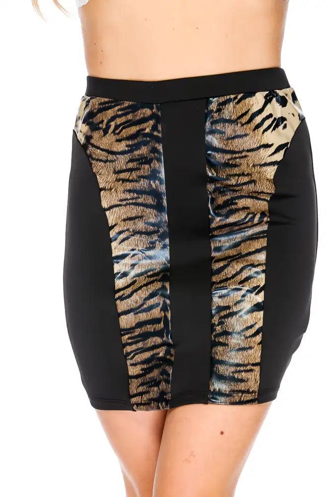 Make a statement with this fabulous skirt! Featuring, high waist, two tone, zebra print, patent detail, stretchy. Followed by a fitted wear. 95% polyester 5% spandex