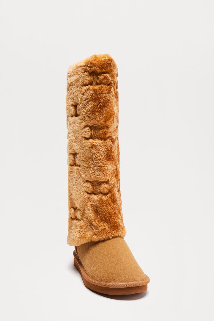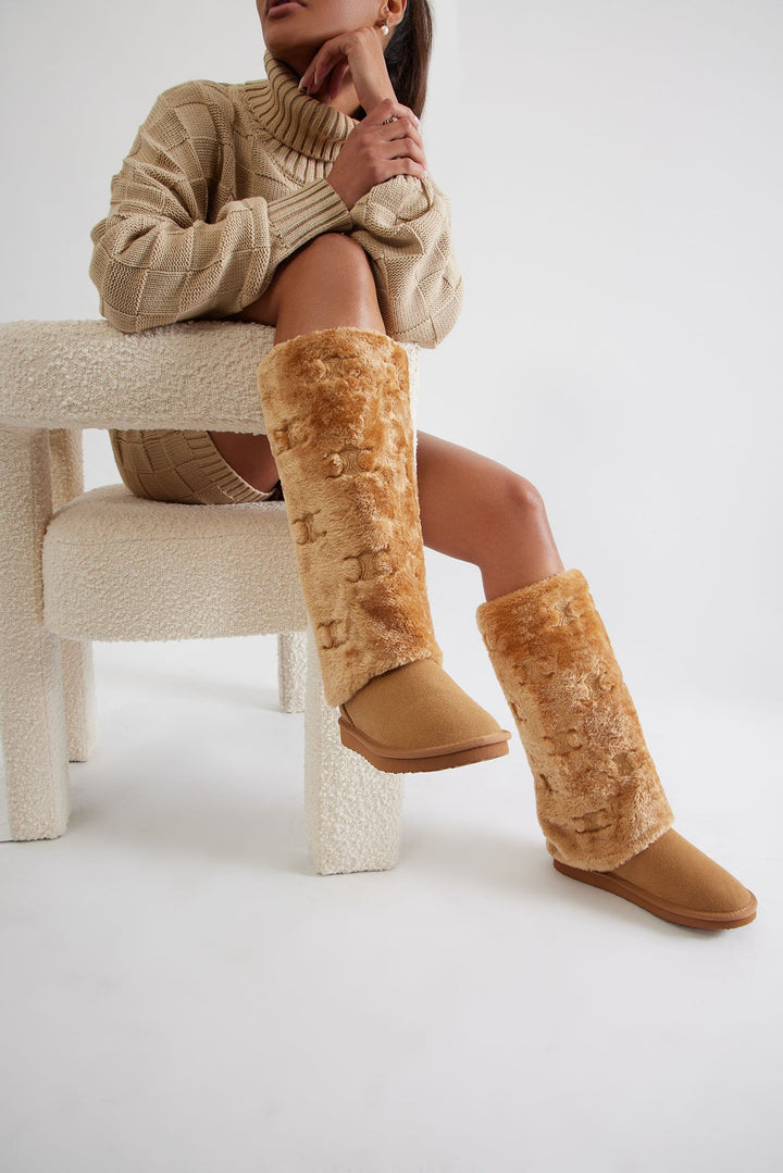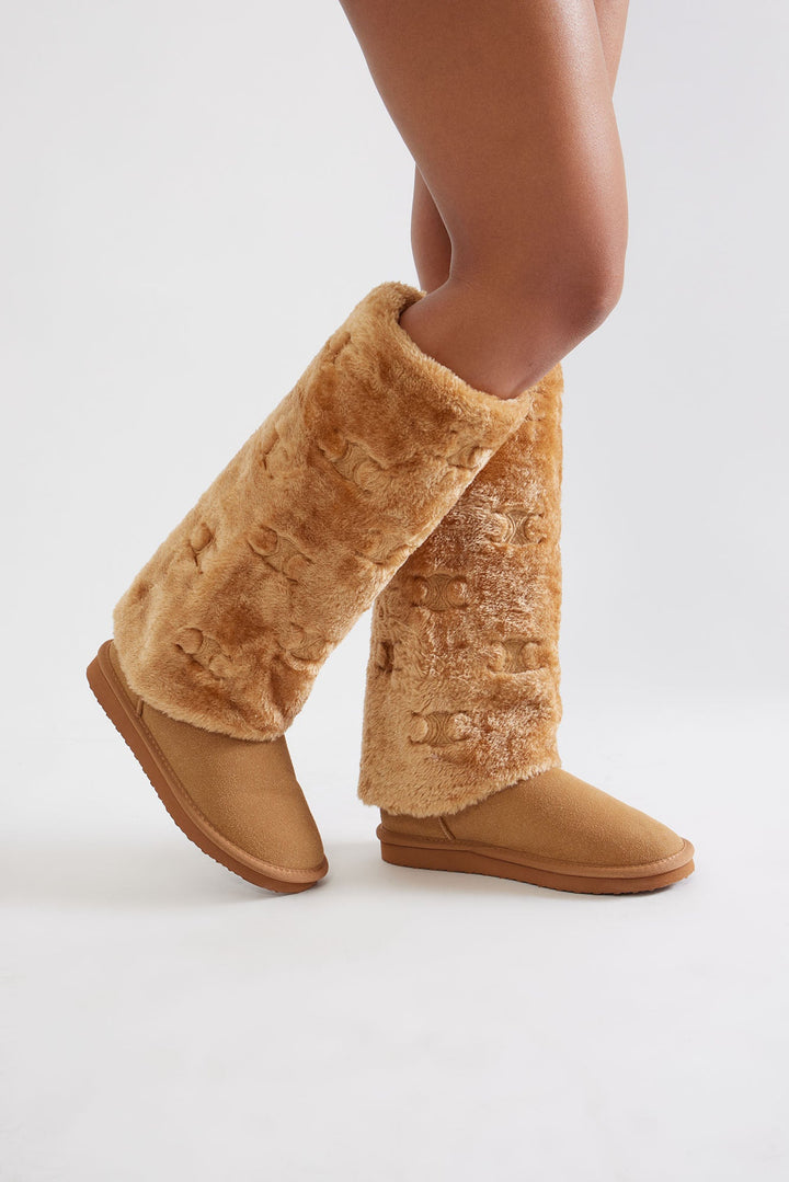Available In Chestnut. | Knee High Flat Boots | Faux Fur | Round Toe | Flat Heel | Imported