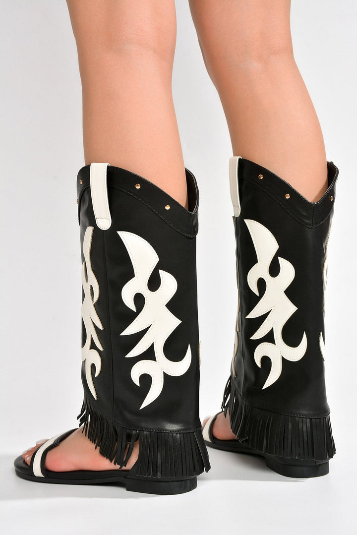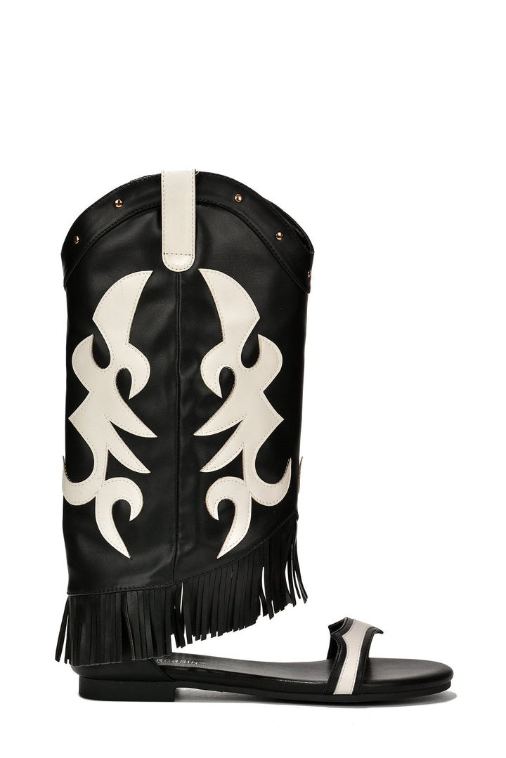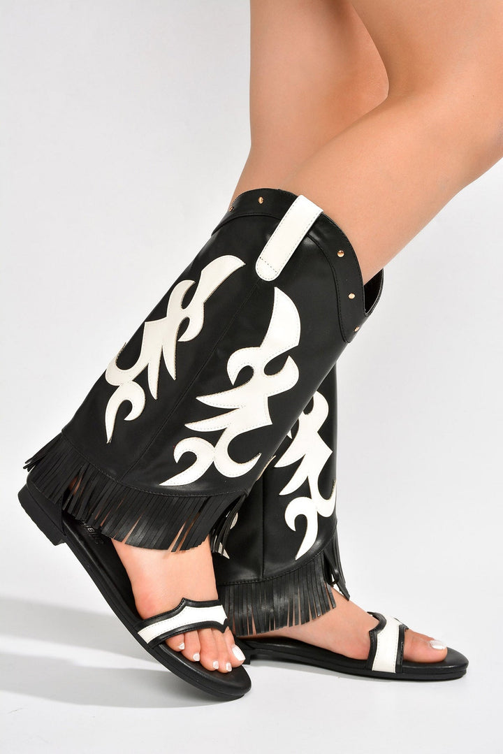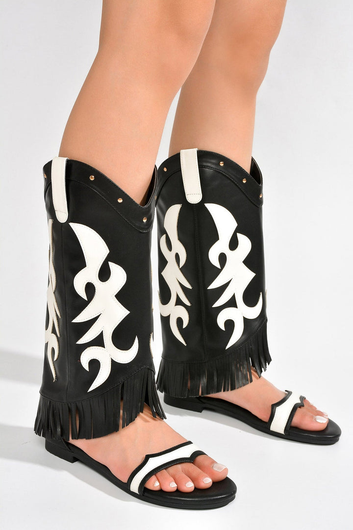 COLLINS - BLACK - SANDALS by CAPE ROBBIN fringe western flat sandals denim pu These stylish Western-inspired flat sandals featuring fringe trim are the ideal choice for a great day in the sun. Slip on your shades and enjoy the fresh air while looking cool and feeling comfortable!