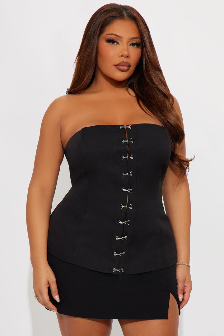 Available In Black And Taupe. | Corset | Hood And Eye Closure | Boning | Shell 97% Polyester 3% Spandex | Lining 100% Polyester | Imported
