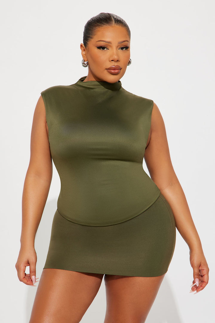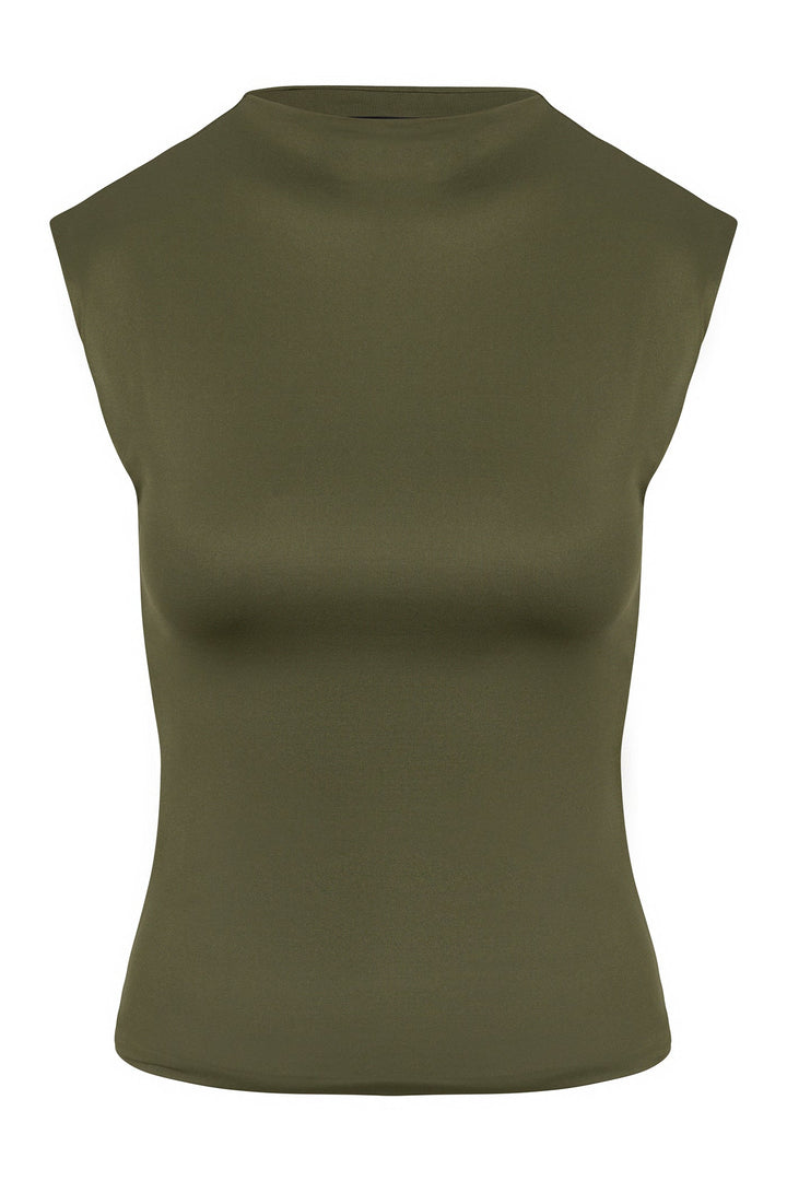 Available In Black, Bone, Chocolate, Military Green, Stone And Wine. | Mock Neck Top | Stretch | Sleeveless | Smoothing And Shaping | Double Lined | Self/Lining: 90%Nylon 10%Spandex | Imported