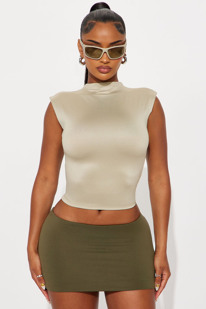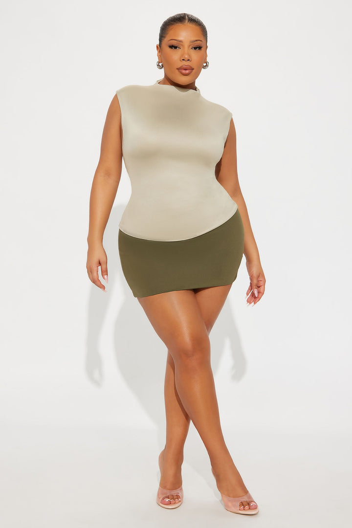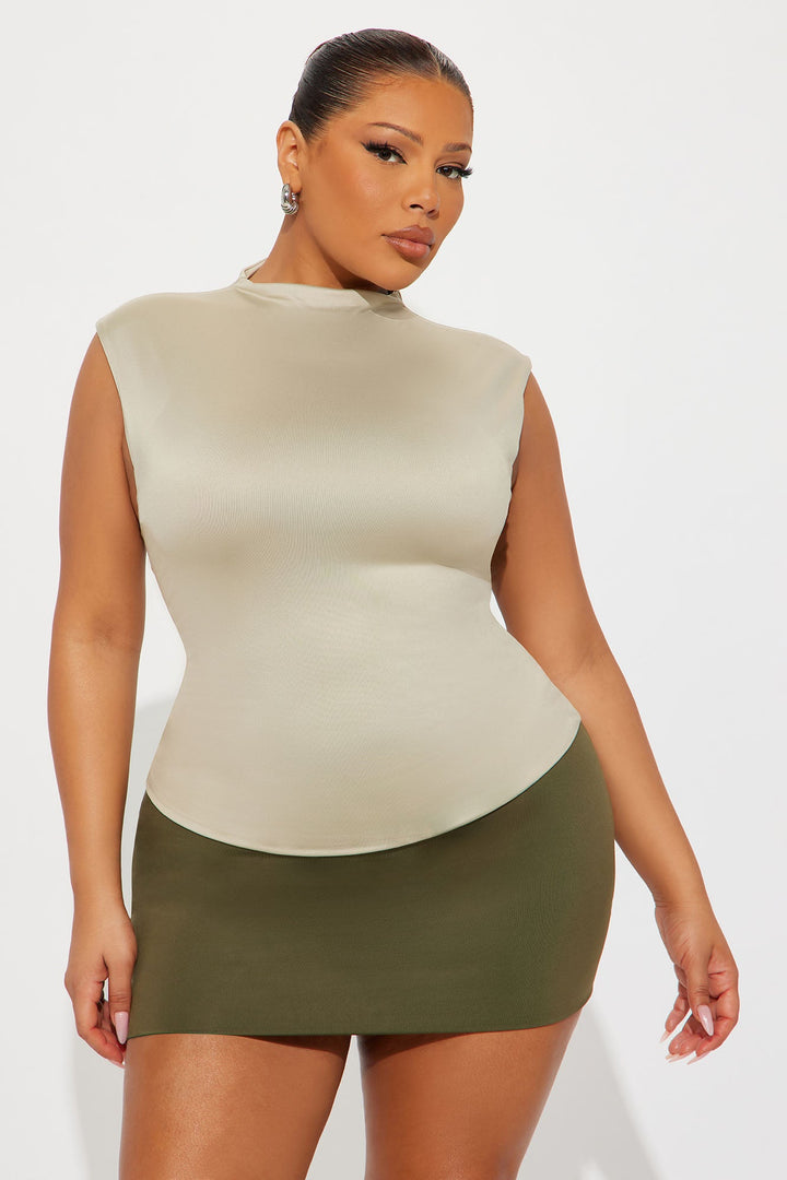 Available In Black, Bone, Chocolate, Military Green, Stone And Wine. | Mock Neck Top | Stretch | Sleeveless | Smoothing And Shaping | Double Lined | Self/Lining: 90%Nylon 10%Spandex | Imported