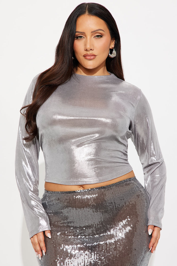 Available In Silver. | Baby Tee | High Neck | Long Sleeve | Stretch | Shell: 95% Polyester 5% Spandex | Imported