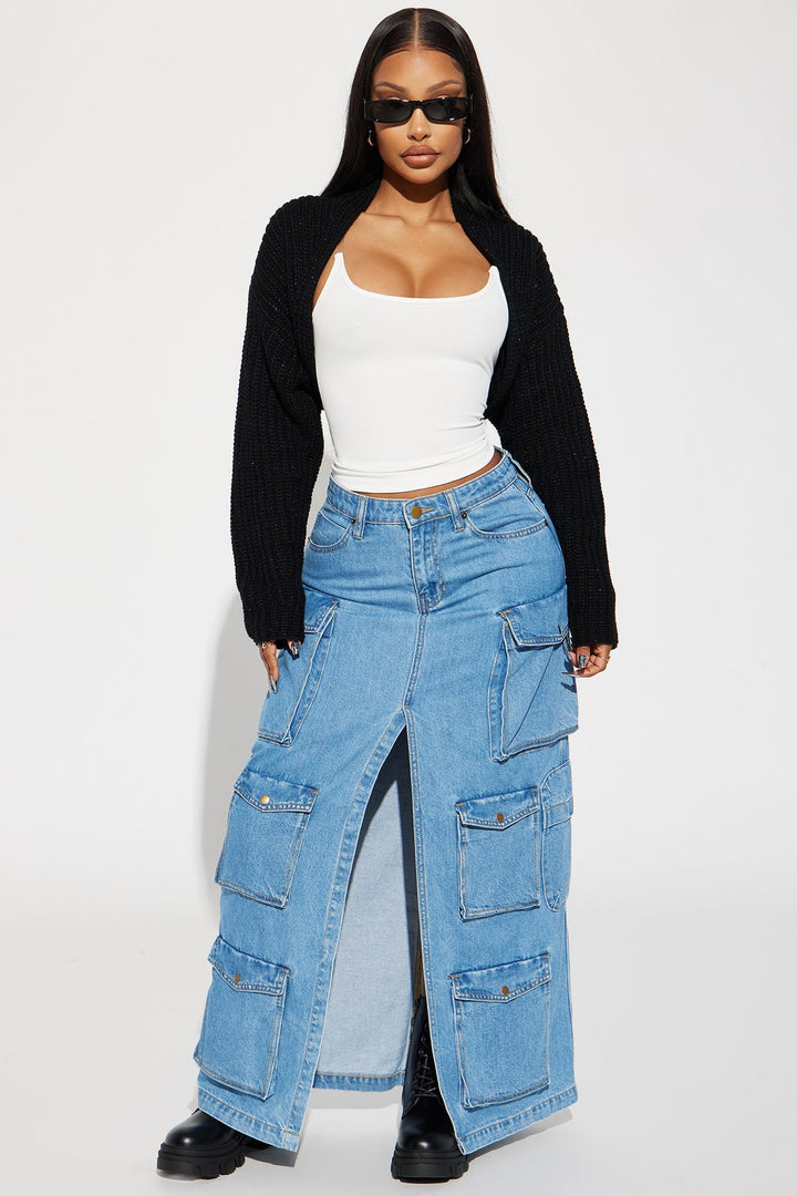 Available In Black And Taupe. | Bolero Sweater | Shimmer | Long Sleeve | Cable Knit | Cropped | 95% Acrylic 5% Metallic | Imported