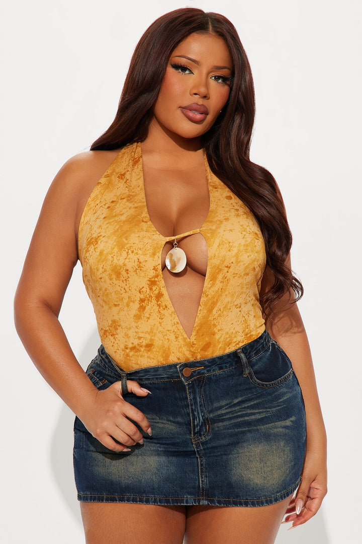 Available In Mocha And Mustard. | Halter Bodysuit | Stretch | Tie Neck | Deep V-Neck | Shell Detail | Seaming | Cheeky Bottom | Snap Closure | Final Sale | Self: 95% Polyester 5% Spandex | Imported