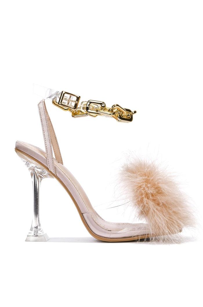 "CORAZON - NUDE - HEELS by CAPE ROBBIN square toe high heels clear finish feather trim chain trim buckle closure Fall in love over and over again with Corazon! These heels are chic,stylish,and sure to \"wow\" the crowd. The clear finish and feather and buckle trim add a sleek and modern look. The buckle closure ensures a secure and comfortable fit. Available in black and nude."