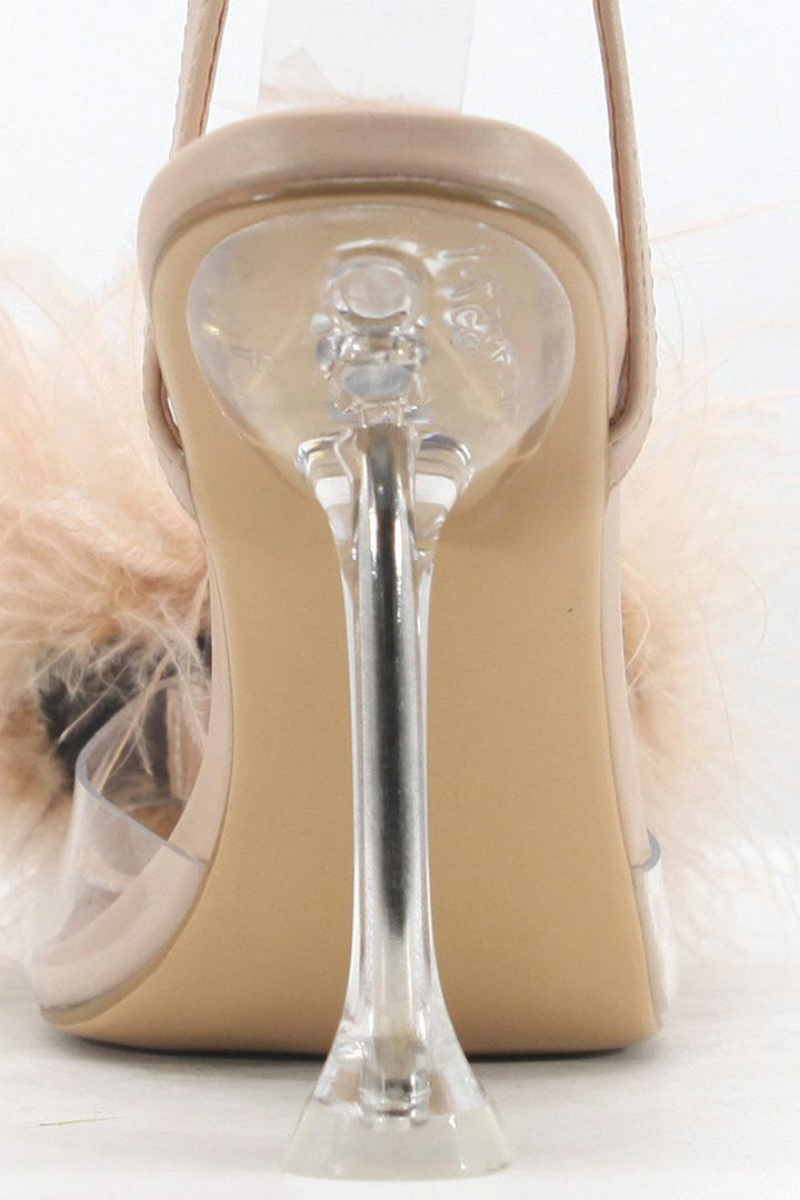 "CORAZON - NUDE - HEELS by CAPE ROBBIN square toe high heels clear finish feather trim chain trim buckle closure Fall in love over and over again with Corazon! These heels are chic,stylish,and sure to \"wow\" the crowd. The clear finish and feather and buckle trim add a sleek and modern look. The buckle closure ensures a secure and comfortable fit. Available in black and nude."