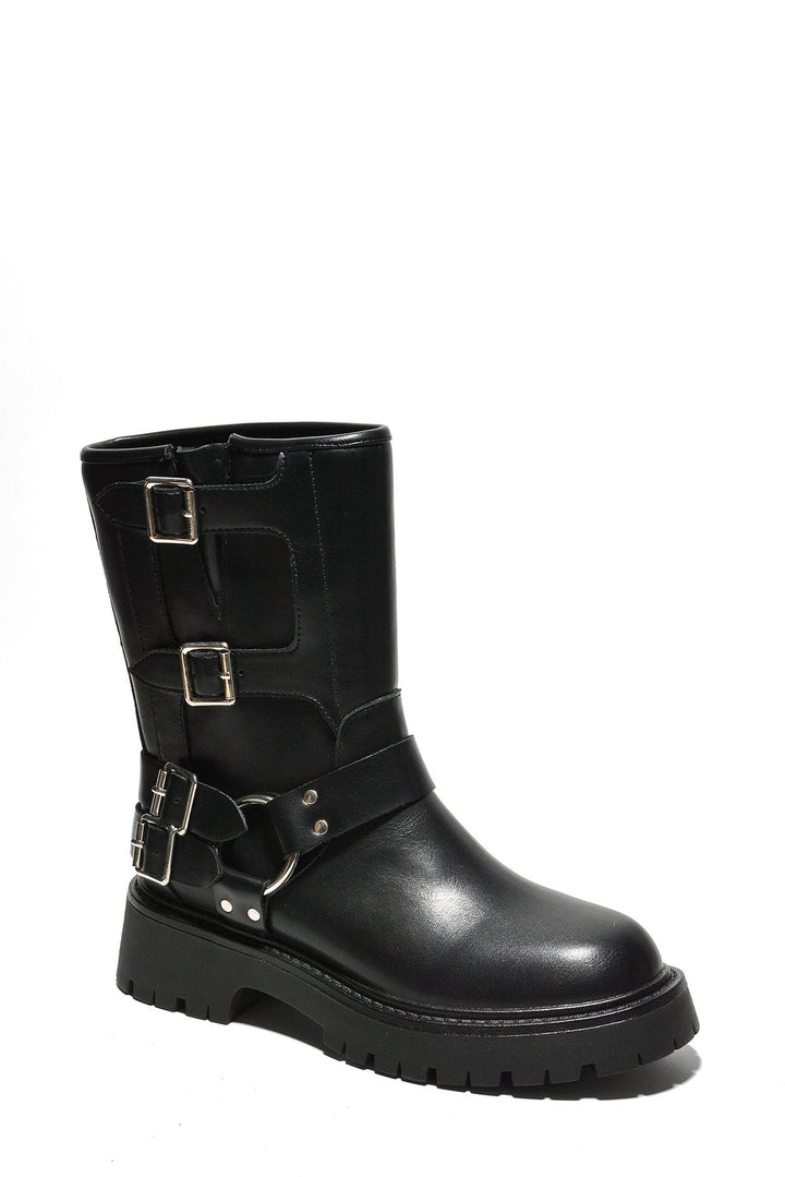 CORDOVA - BLACK - BOOTIES by CAPE ROBBIN closed square toe PU metallic denim block heel buckle detailing rubber outsole true to size lightly cushioned footbed Cordova revs up your style in this ultra-trendy biker-inspired ankle boots. Features strap accents and buckle hardware. It's time to show extra attitude and your alt-chic,edgy side.