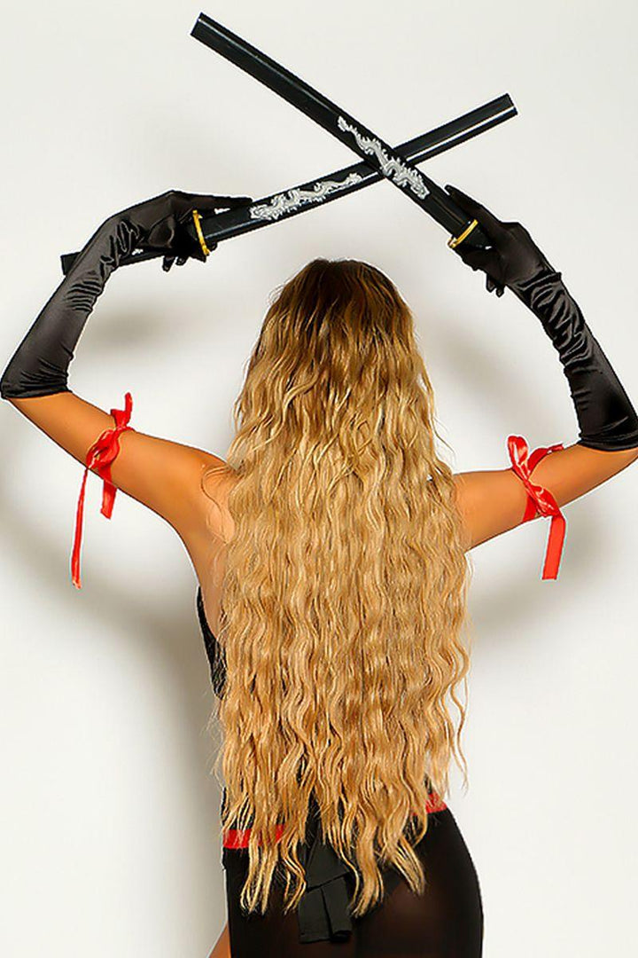 Pair of long Ninja swords. Features; include dragon detail, sword holster covers in which you are able to pull out the sword for more authenticity to your costume
