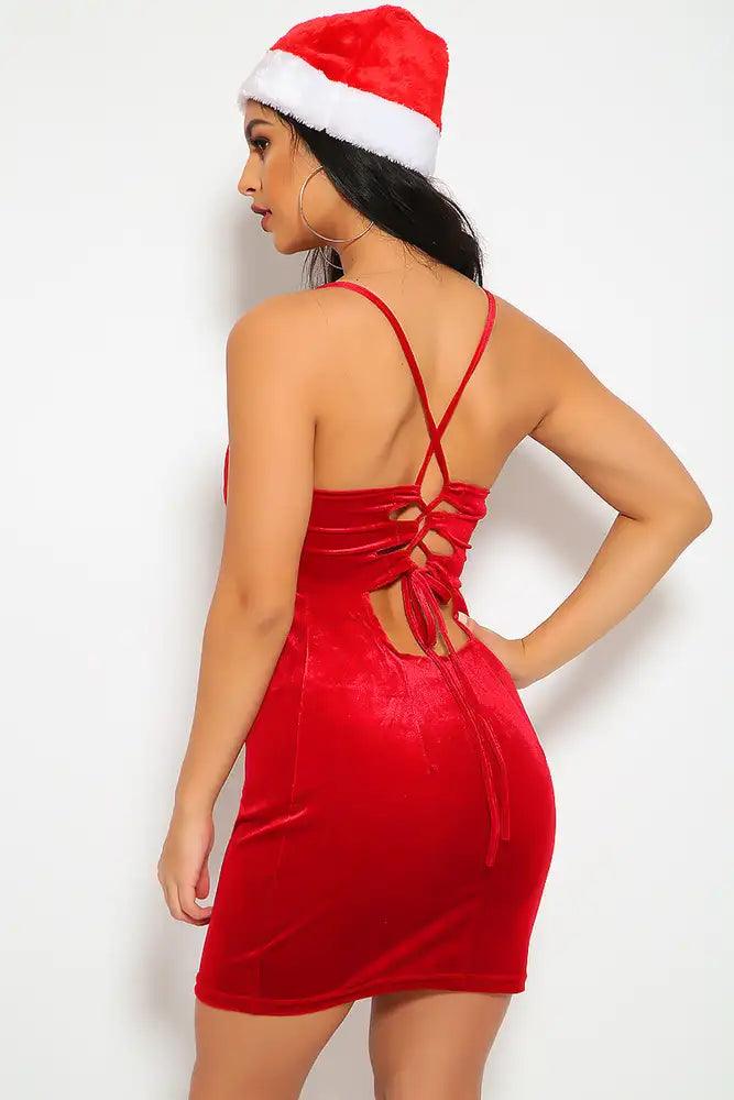 Have a little holiday fun with this sexy costume! Featuring; sleeveless, velvet, v cut neckline, back lace up tie, cut out detail. Followed by a fitted wear. 100% polyester. Please note hat is not included.