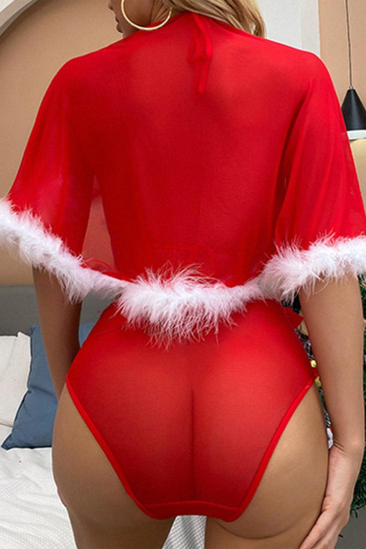 Red Mesh Cape Faux Fur Trim Sexy Three Piece Holiday Costume