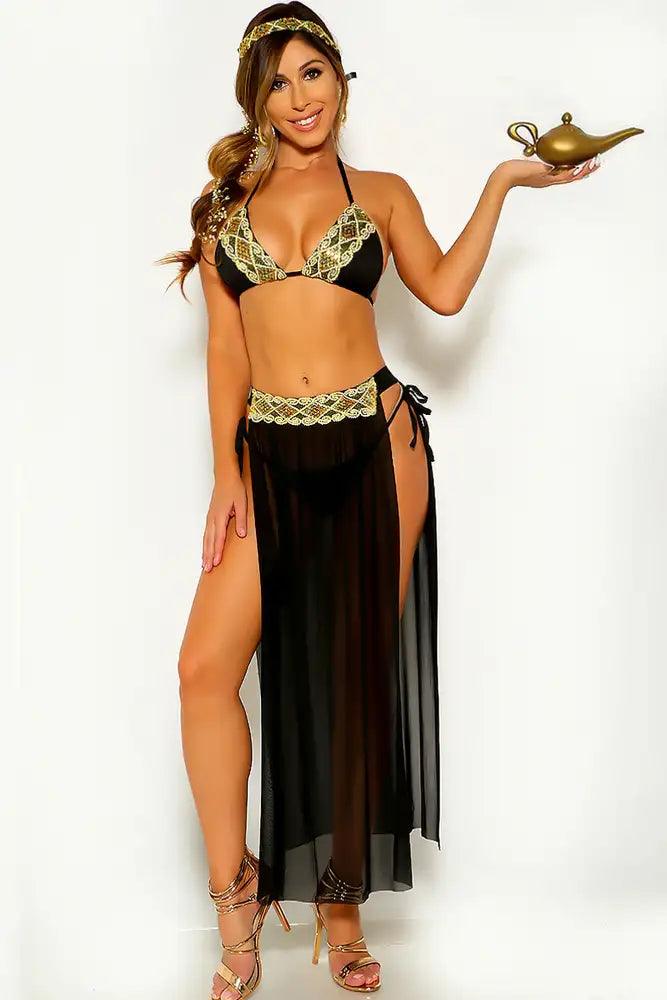 Show off your mermaid side with this sexy costume! Featuring; 4 piece, Triangle top with gold detail, bikini bottoms, with a skirt over lay, and head band. Please note; pitchfork, pearls and stockings, and hair piece are NOT included.
