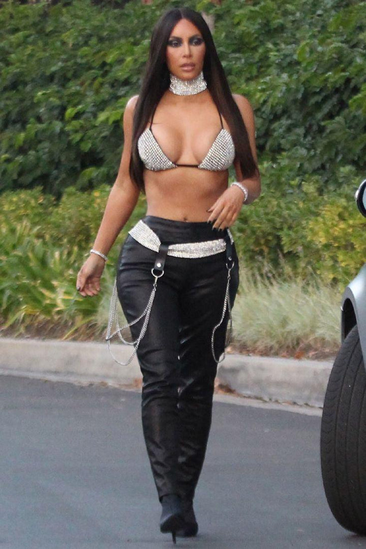 Create a costume with this versatile three piece set. Featuring, rhinestone halter top, and faux leather bottoms