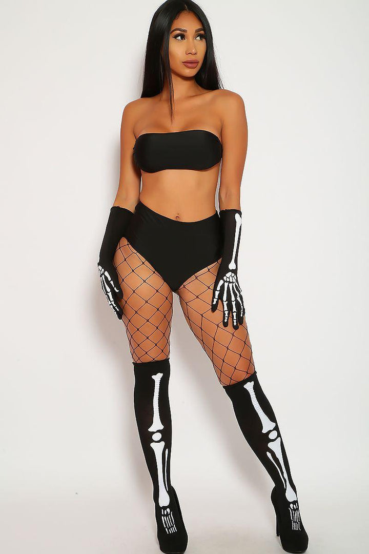 This 4Pc. Skeleton costume is sexy and unique. Includes strapless top, boy shorts, skeleton gloves, and skeleton knee socks.