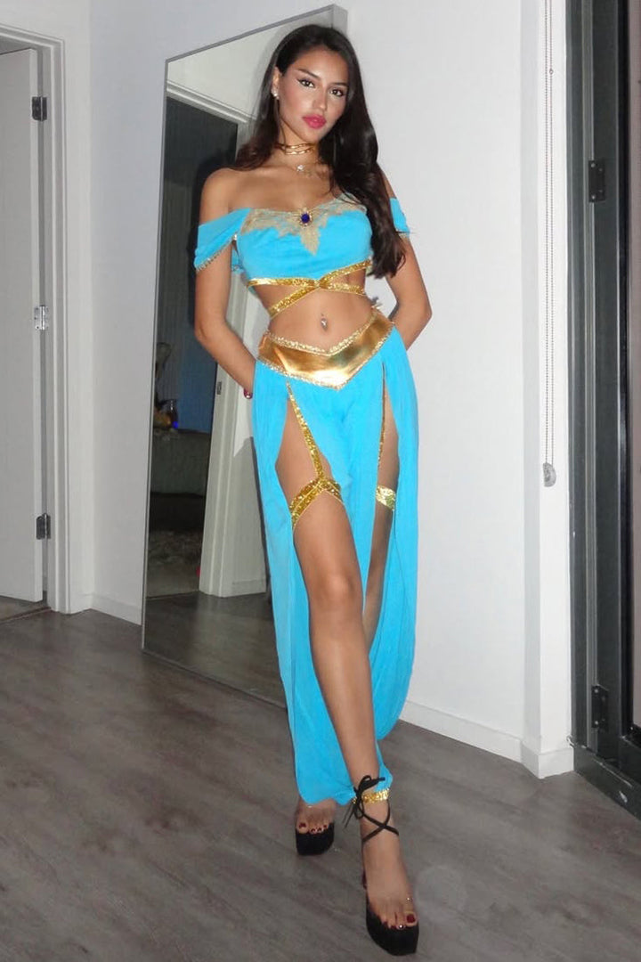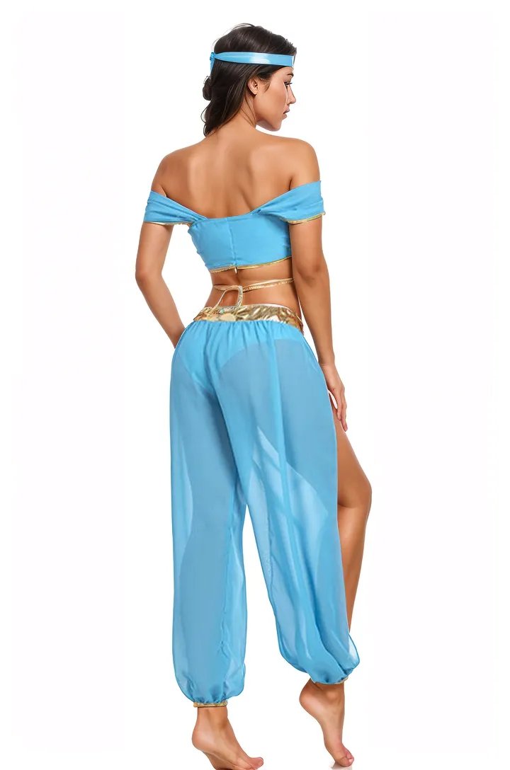 Features: Top, Pants with slit, Headband, Underwear. Make a magical statement with our dazzling Blue Gold Sequin Gem 4 Pc Princess Jas Costume! The shining sequin details, jewels, and bold colors will have you radiating regal vibes. Slay the night like the princess you really are!