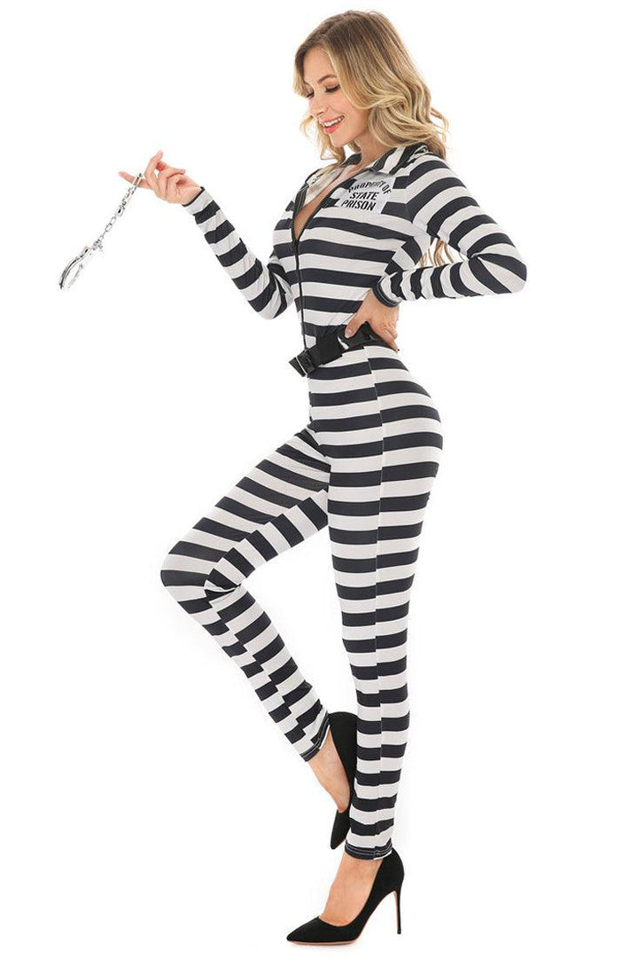 This Black White 3-Piece Prisoner Inmate Costume is perfect for your next theme party. The fabric is comfortable and durable to give you an authentic jailbird look. Features: Black white zipper jumpsuit, belt, handcuff.