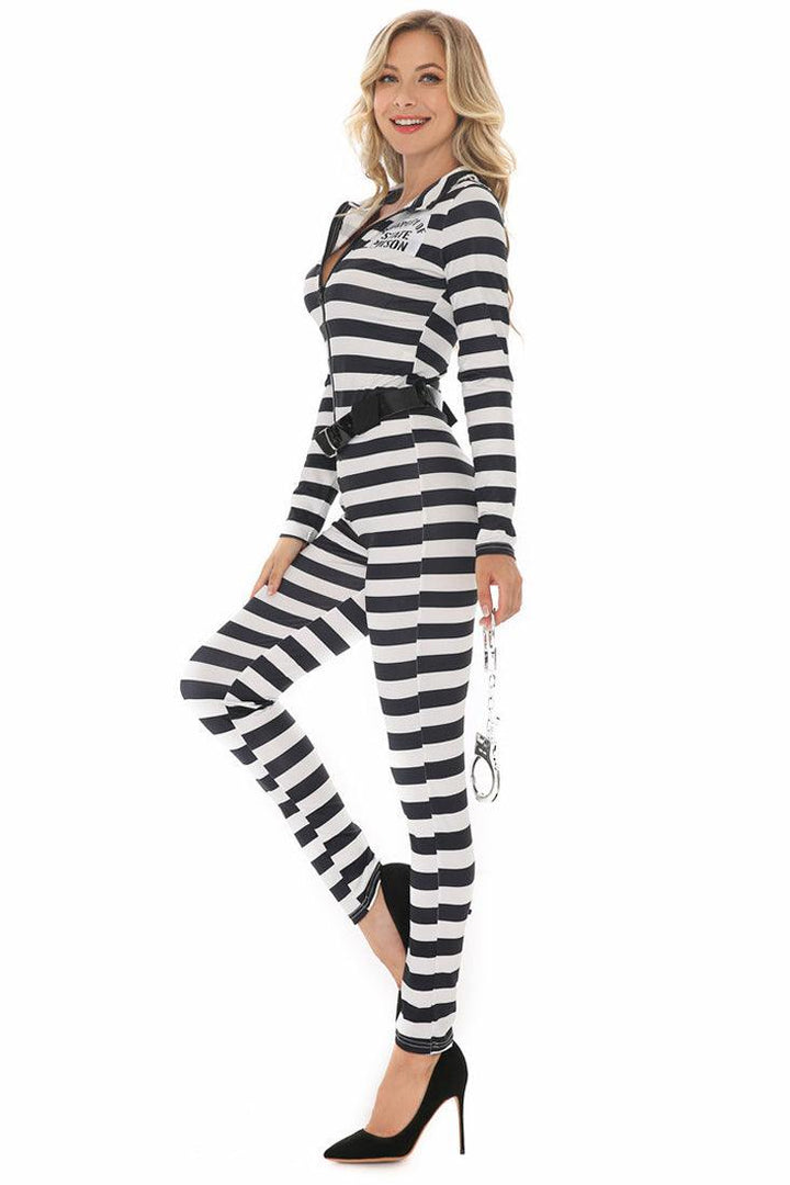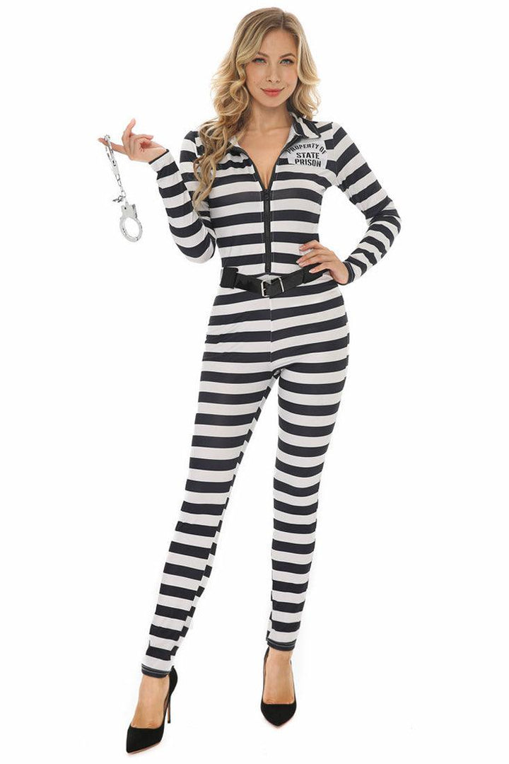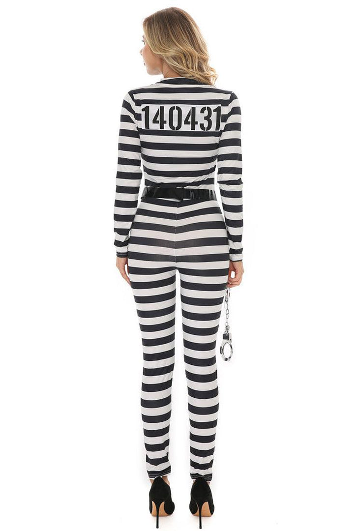 This Black White 3-Piece Prisoner Inmate Costume is perfect for your next theme party. The fabric is comfortable and durable to give you an authentic jailbird look. Features: Black white zipper jumpsuit, belt, handcuff.