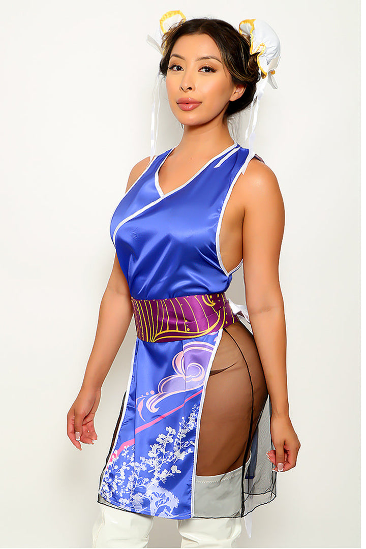 Features: Printed satin dress, black mesh slip, belt. Unleash your inner fighter with this Blue Satin Belt High Slit Sexy Video Game Chunli Costume. Made from luxurious red satin fabric, this costume features a high slit for added sexiness and a matching belt for a cinched waistline. Perfect for cosplay events or a playful night in.