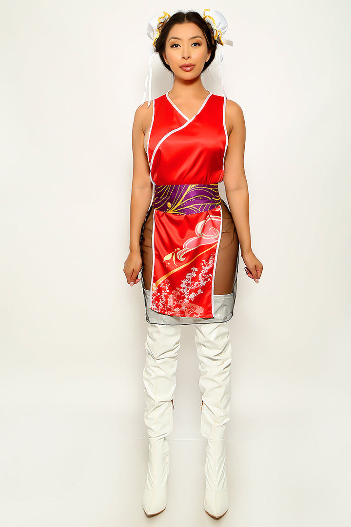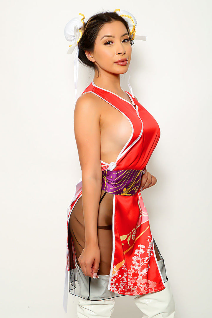 Features: Printed satin dress, black mesh slip, belt. Unleash your inner fighter with this Red Satin Belt High Slit Sexy Video Game Chunli Costume. Made from luxurious red satin fabric, this costume features a high slit for added sexiness and a matching belt for a cinched waistline. Perfect for cosplay events or a playful night in.