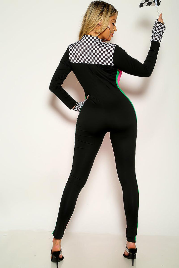 Vroom, vroom! Drive your way to the top of the competition when you show up to your next Halloween party in this race car driver 3 Pc costume! Featuring; a clean white and black checker print jumpsuit with a stand up collar and exposed zip front, American flag and "Oil Me" bust patches, fingerless checker gloves, and reflective aviator glasses. *Checkered flag and shoes are NOT included.