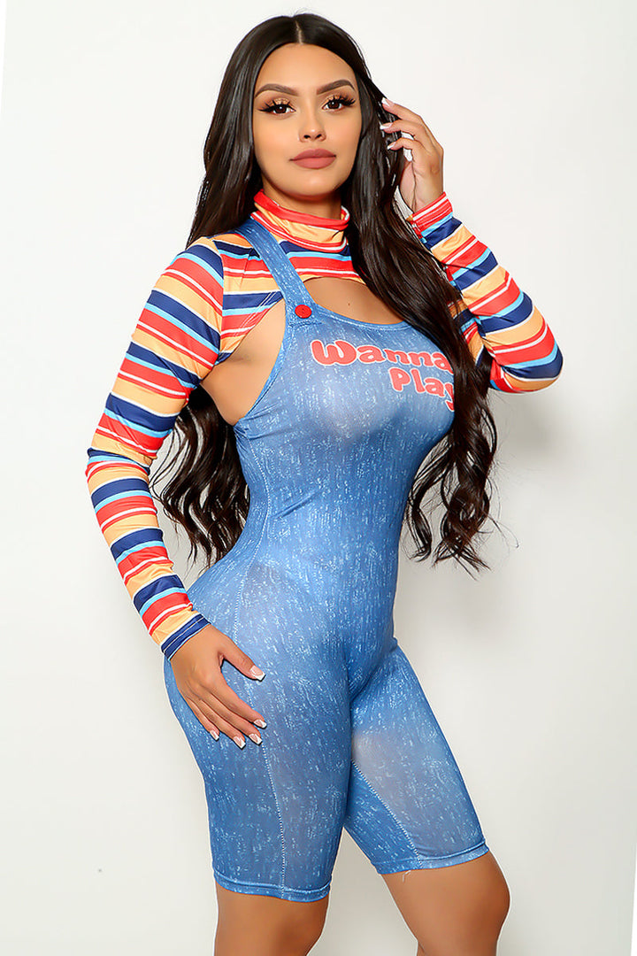 Multi Stripe Blue Overall Biker Shorts 2 Pc Scary Doll Sexy Costume