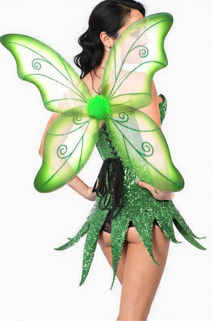Green Glitter Lace-Up Dress Pom Pom Wings Sexy Tinkerbell Costume