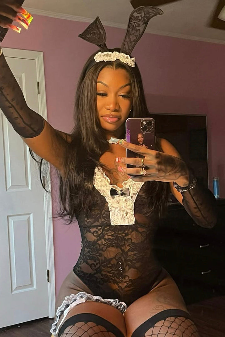 Costume includes; two tone lace floral sheer open crotch bodysuit with cottontail , headband with ears, with lace arm gloves. Undergarment,thigh highs and heels not included