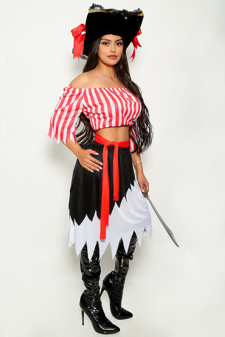Features: head scarf, belt, top, skirt. Ahoy, matey! Command the high seas in this striking Red White Stripe Sexy Pirate Costume. The bold stripes add a touch of sass to your swashbuckling adventures. With flirty flair and a hint of danger, this costume will have everyone surrendering to your charm.