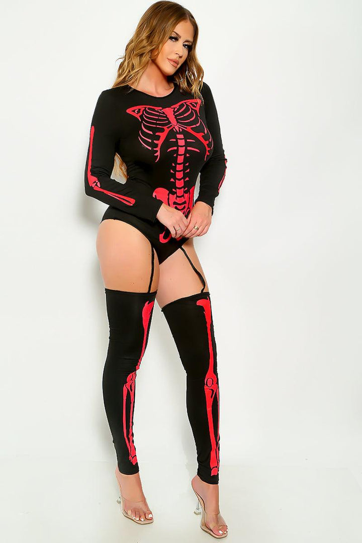 Sexy Bone-A-Fide Skeleton Black Red Long Sleeve Bodysuit 3 Pc Costume