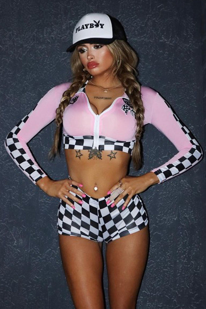 Costume includes; checker print, zip up closure, flag patches detailing, long sleeves, cropped, with matching checker mini shorts and fitted. Boots and Choker not included. (Shade of pink may look different under studio lighting. )