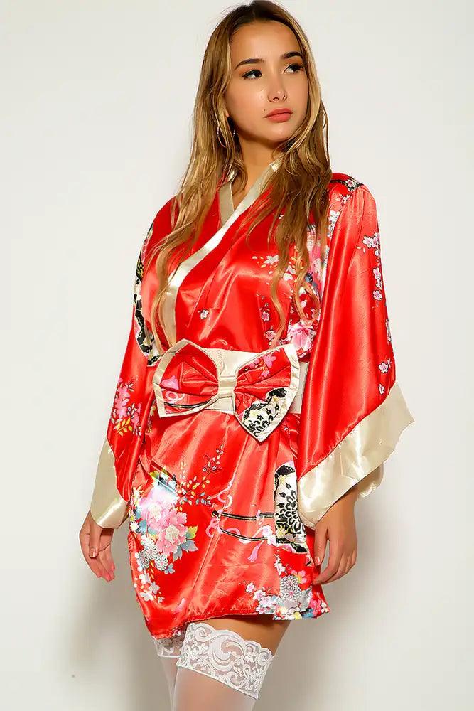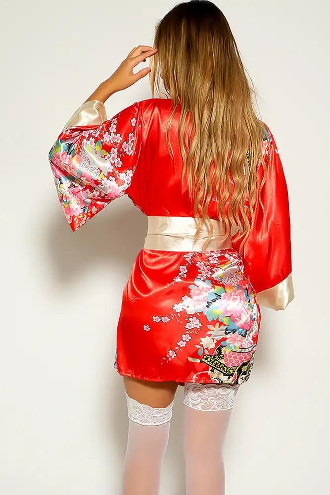 Red Sexy Floral Print Traditional Japanese Kimono 3pc Sexy Costume