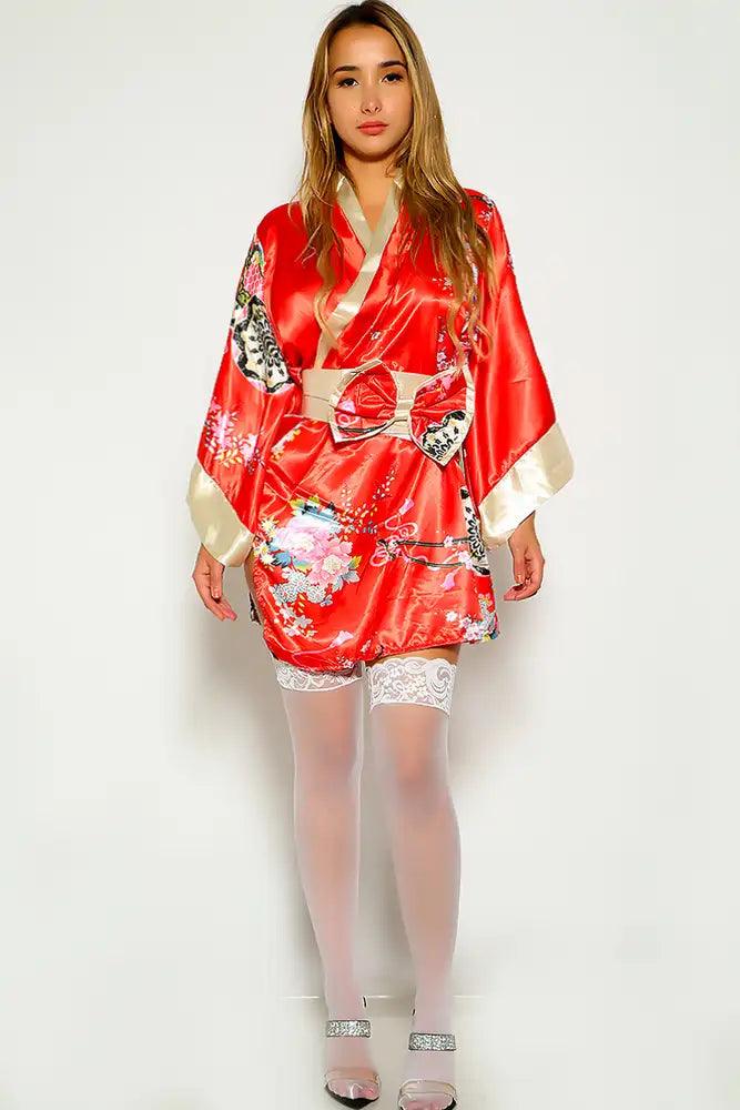 Red Sexy Floral Print Traditional Japanese Kimono 3pc Sexy Costume