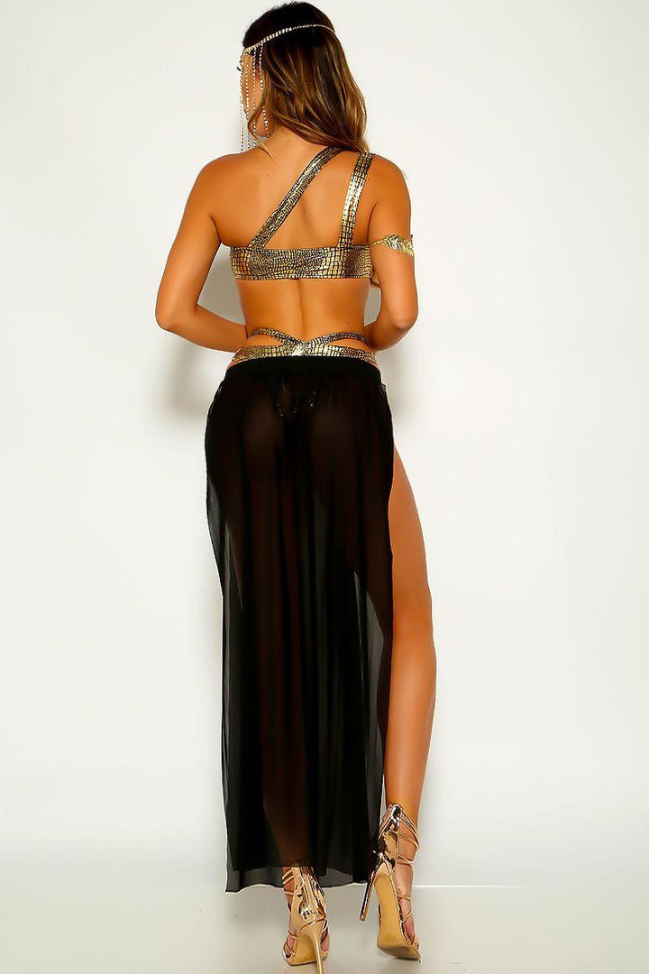 Turn heads on Halloween with this sexy 3 piece goddess costume! Featuring; sleeveless, one shoulder,cut out, bandeau, snake print, top, matching bottom, with a mesh side slit skirt.