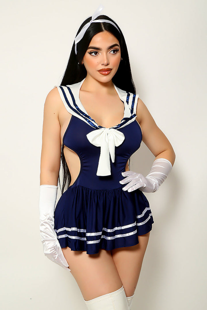 Navy White Square Collar Cut-Out Bow Backless Sexy Sailor Dress Costume