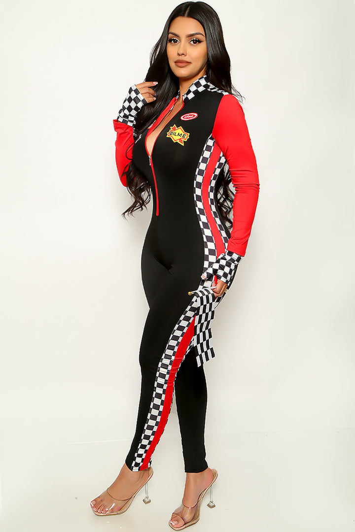 Features: long sleeve full length jumpsuit, gloves. Race to the finish line in style with this Black Red Stretchy Fitted Zipper Sexy Checkered 3Pc Racer Costume! Made with high-quality materials, this costume is sure to turn heads. The stretchy fit ensures all-day comfort, while the zipper adds a touch of sexiness. Perfect for any racing enthusiast