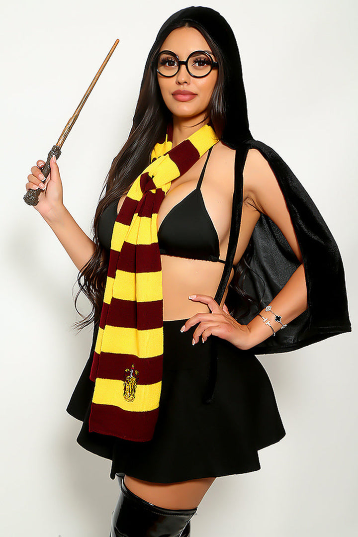 The features include: Triangle top, velvet cape, skater skirt, stripe knitted scarf. Become the sexiest wizard this Halloween with our Burgundy Sexy Wizard 4Pc Triangle Top Skater Skirt Cape Harry Costume. Includes green triangle top, skater skirt, and a cape. Perfect for casting spells and stealing hearts.