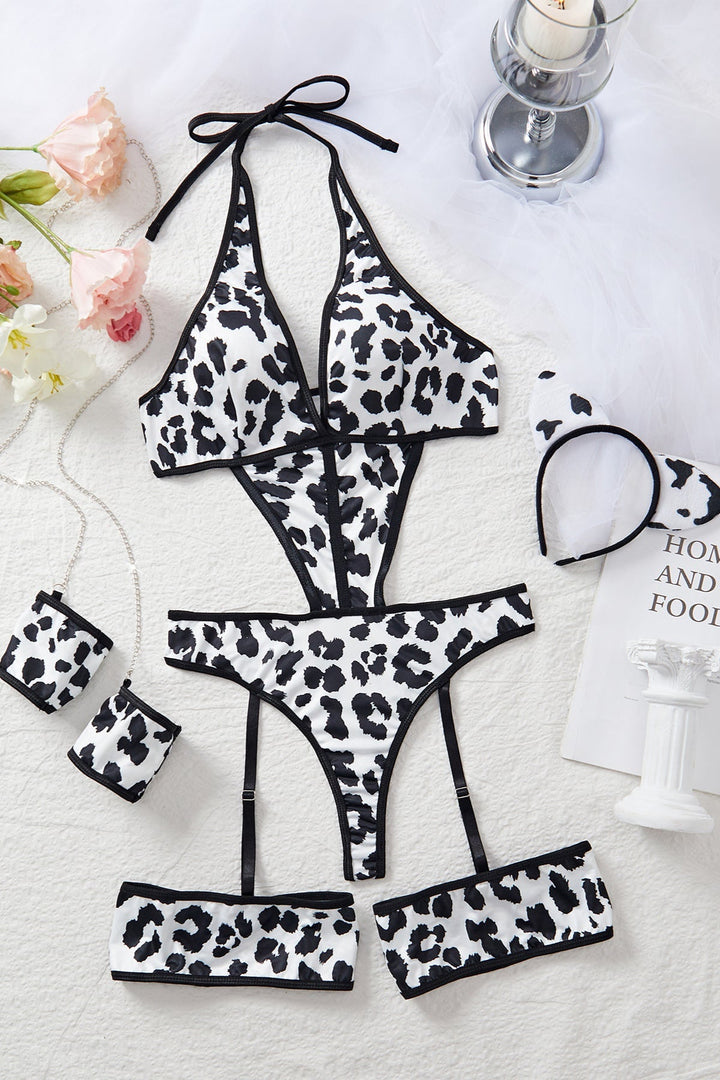 White Black Animal Print Garter Chain Sexy Leopard Kitty Costume