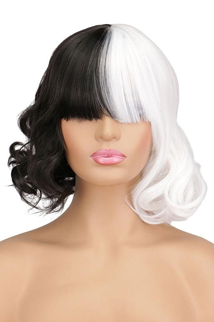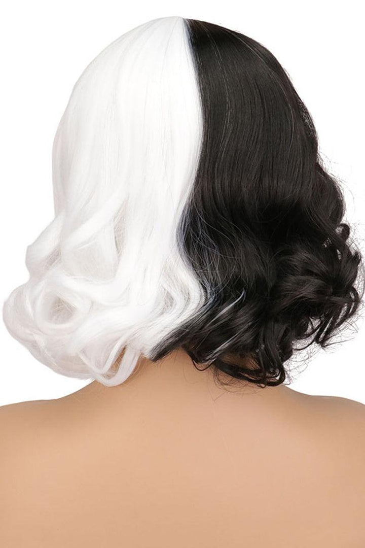 Black White Mid Length Wavy Two Tone Cruella Wig Costume Accessory