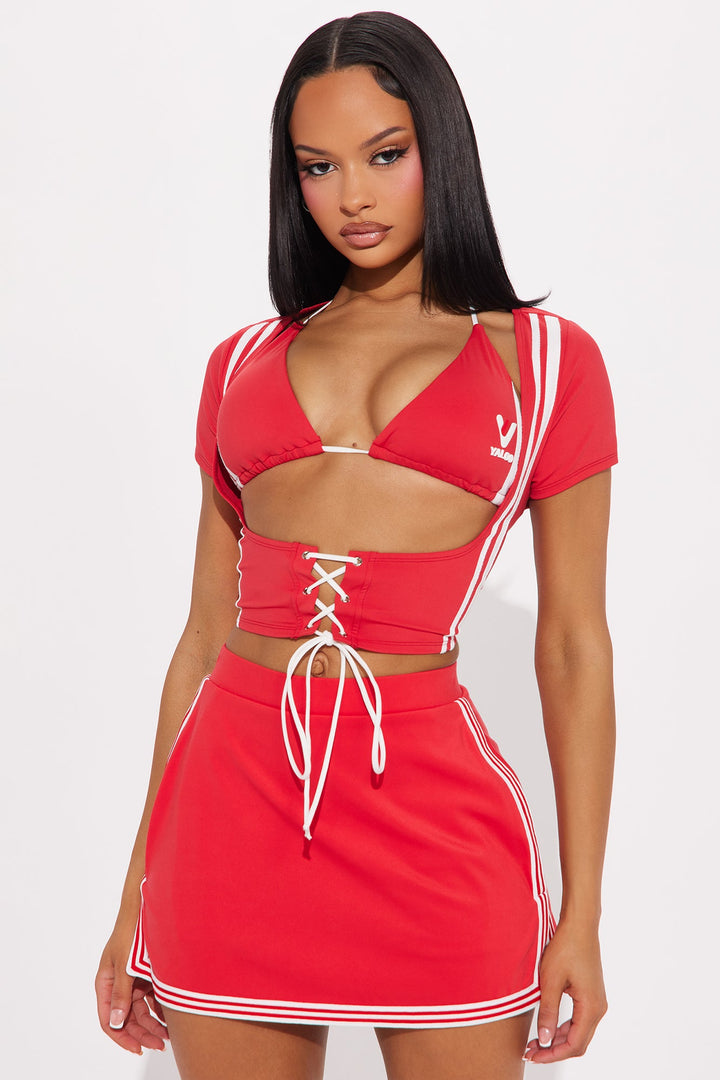 Available In Red. | Short Sleeve | Lace Up Detail | Bikini Top | Stretch | Shell: 75% Nylon 25% Spandex | Imported