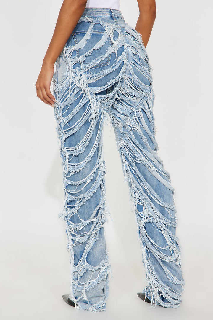 Available In Light Wash. | Straight Leg Jean | 5 Pocket | Destructed Layered Detail | Seaming | 11" Rise | 32" Inseam | Medium Stretch | Disclaimer - Due To The Specialized Distressing & Wash Process, Each Garment Is Unique. | Self: 24% Cotton 63% Rayon 10% Polyester 3% Spandex | Contrast: 100% Rayon | Imported