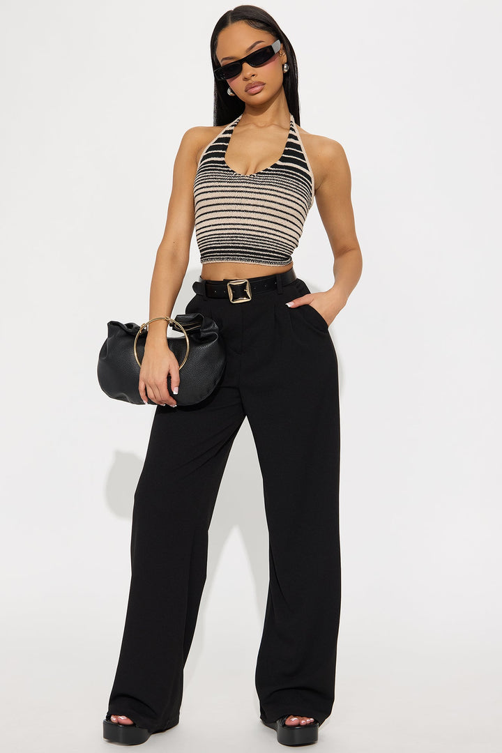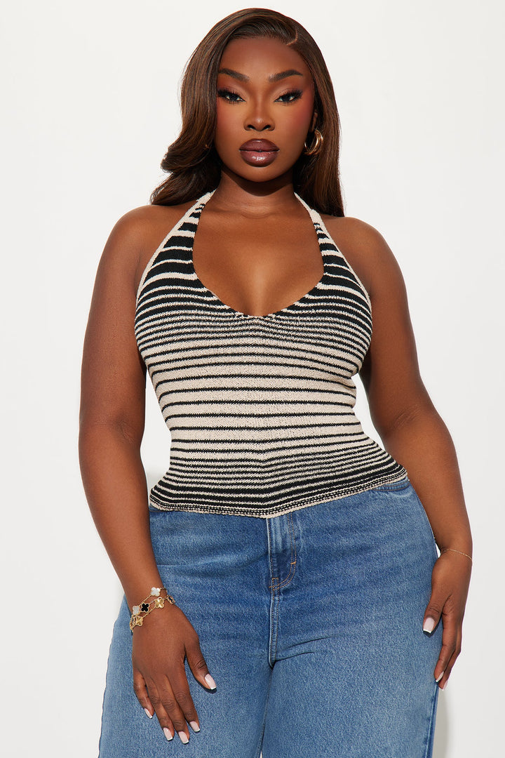 Available In Black/combo, Blue/combo And Taupe/combo. | Striped Sweater Top | Halter With Tie Closure | V-Neckline | 100% Polyester | Imported